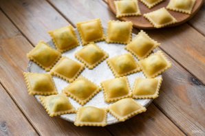 В сотейнике доведите до кипения 1-2 литра воды и закиньте в активно кипящую воду партию приготовленных заготовок равиолей. Варите равиоли 7-8 минут.