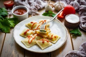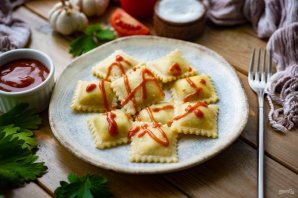 Затем выловите шумовкой готовые равиоли, выложите в тарелку и подавайте к столу с любимым соусом.