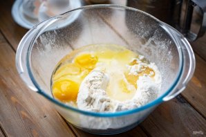 Сначала приготовьте тесто. В просторную миску просейте всю муку, добавьте соль, вбейте яйца и введите оливковое масло.