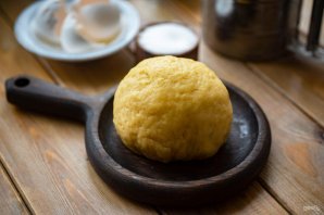 Замесите плотное, тугое тесто, которое не прилипает к рукам. При необходимости добавьте совсем немножко воды, но я не добавляла. Округлите тесто, оберните в пищевой полиэтилен и отправьте на полку холодильника на 30 минут.