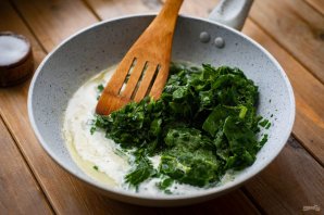 Займитесь начинкой для равиолей. В сковороде на небольшом огне растопите сливочное масло и выложите замороженный шпинат. Сначала некоторое время следует выпаривать образовавшуюся жидкость, после чего размякший шпинат, помешивая лопаткой, обжарьте 3-4 минуты на среднем огне.
