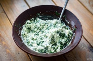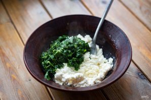В миску выложите творог и разомните его вилкой, добавьте обжаренный шпинат, соль.