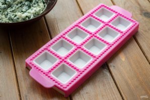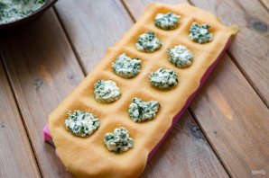 Тонкий пласт теста поместите на форму и в каждую ячейку формы выложите примерно по чайной ложке начинки из творога и шпината.
