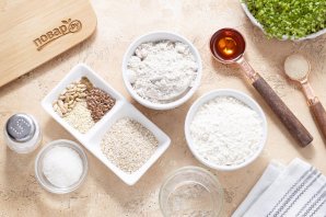 Отдельно смешайте оба вида муки с отрубями, солью, специями и семечками.