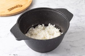 Рис промойте до прозрачности. Залейте чистой водой, доведите до кипения, перемешайте. Убавьте огонь на минимум, варите 15 минут под крышкой. Затем накройте кастрюлю чистым полотенцем и сверху крышкой, оставьте еще на 15 минут. Немного остудите рис, добавьте рисовый уксус, соль и сахар, перемешайте.