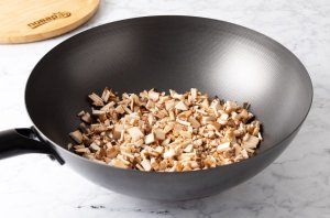 Шампиньоны мелко нарежьте и обжарьте с небольшим количеством растительного масла до золотистого цвета. В конце посолите по вкусу и добавьте устричный соус.