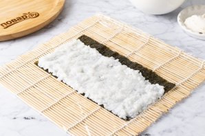 Лист нори разрежьте пополам. Выложите шершавой стороной вверх на циновку. Распределите тонким слоем рис, оставив 1 см. свободного края.