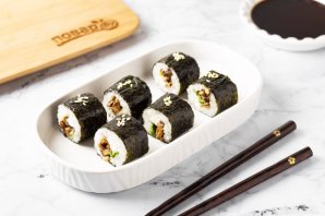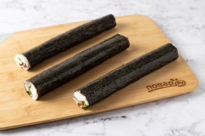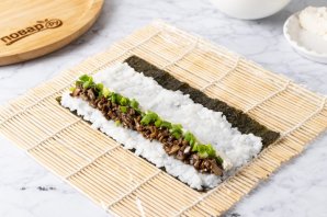 Выложите поверх риса начинку из грибов, зелёный лук и сливочный сыр. Смочите свободный край нори водой и скатайте ролл. Плотно прижмите его циновкой.