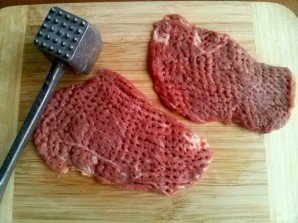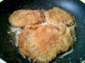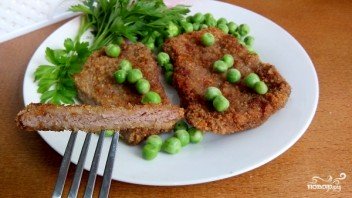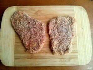 Натріть відбиті шматки м'яса сумішшю солі та перцю, змочіть їх у збитому яйці, а потім обваляйте у сухарях.