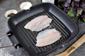 Филе посолите и поперчите по вкусу, сбрызните лимонным соком, обжарьте в сковороде-гриль минуты по две с каждой стороны.