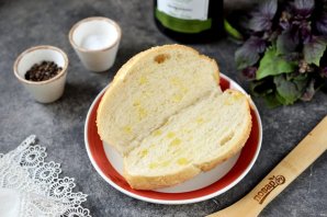 Хлебную булку надрежьте с одной стороны, раскройте ее в виде книжки, сбрызните мякиш оливковым маслом.