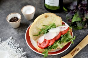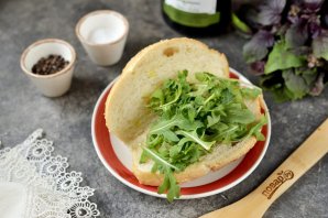 На одну половину булки выложите любую зелень — латук, айсберг или рукколу.