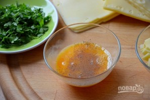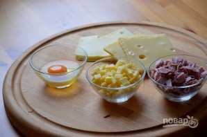 1. Одно яйцо вбиваю в миску, одно оставляю для смазывания. Сыр нарезаю кусочками, можно и на терку, ветчину нарезаю такими же кусочками, как и сыр.