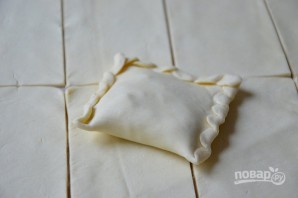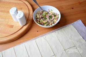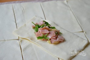 3. Ко взбитому яйцу добавляю сыр, ветчину и петрушку, перемешиваю. Слоеное тесто раскатываю в тонкий пласт, сохраняю прямоугольную форму.