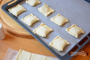 6. Противень застилаю пекарской бумагой и выкладываю самсу. В отдельной миске взбиваю оставшееся куриное яйцо и кистью смазываю выпечку.