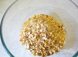 2. У мене суміш горіхів (грецькі, мигдаль і ліщина), смажу їх кілька хвилин на сковороді, потім теж подрібнююю скалкою, залишаючи невеликі шматочки. Додаю горіхи до печива.