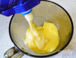 3. Вершкове масло розтоплюю в мікрохвильовій печі, потім охолоджую його до кімнатної температури і змішую із згущеним молоком.