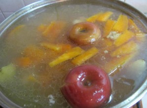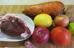 Через 30 хвилин виймаємо яблука, додаємо до шурпи помідори, нарізані крупно (можна перетерти в пюре). Також додаємо часник, спеції, вичавлюємо сік лимона. Шурпа повинна ще приблизно 30 хвилин томитися. Готову шурпу по-кавказьки подаємо з зеленню.