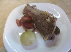 Бульйон готовий — виймаємо м'ясо, цибулю та базилік викидаємо.