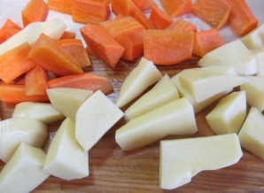 Бульйон не вимикаємо, нарізаємо картоплю та моркву і відправляємо в бульйон.