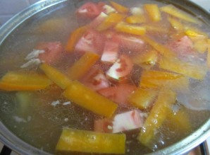 Через 30 хвилин додаємо в шурпу болгарський перець. Нагадаю, вогонь має бути малий.