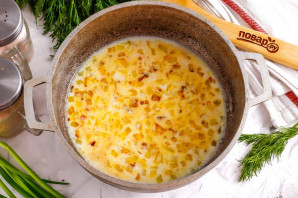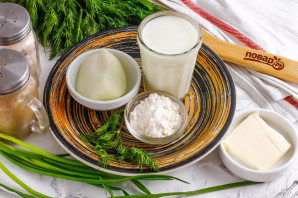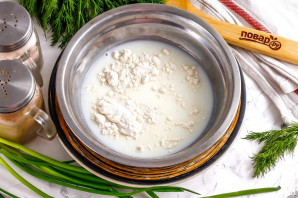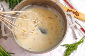 Влийте холодне молоко в глибоку ємність і додайте сіль та пшеничне борошно. Додавайте борошно тільки в холодну рідину, щоб не утворювалися комірці. Можна підсмажити борошно з уже пасерованою цибулею, тоді воно теж не утворить грудочок у соусі.