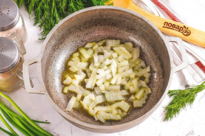 Очищений і промитий цибулю наріжте дрібними кубиками. Розтопіть у казані або на сковороді з високими бортиками вершкове масло і викладіть у нього цибулеву нарізку.