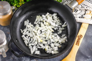 Цибулю очистіть від шкірки та промийте у воді. Наріжте дрібними кубиками і висипте в сковороду з підігрітим рослинним маслом без аромату.