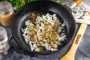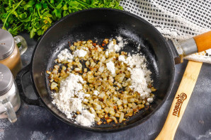 Смажте цибулю та базилік приблизно 2-3 хвилини до золотистого кольору. Додайте пшеничне борошно і ретельно вимішайте силіконовою лопаткою, щоб воно вбирає олію і трохи підсмажилося. Приблизно 1 хвилину.