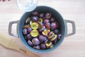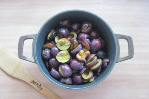 Разрежьте каждую сливу и удалите косточку. Гнилые и поврежденные плоды не берите. Выложите сливы в кастрюлю или таз с толстым дном или антипригарным покрытием.