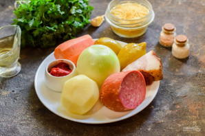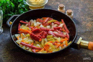 Розігрійте сковороду, влийте олію. Спочатку смажте моркву та цибулю 3 хвилини. Потім додайте копченості, огірки та смажте, помішуючи, 3-4 хвилини. Додайте томатну пасту, перемішайте та перекладіть заправку в каструлю з картоплею.