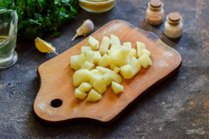 Картоплю очистіть, вимийте та наріжте невеликими кубиками, залейте водою та варіть 10 хвилин.