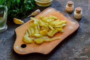 Солоні огірки наріжте смужками.