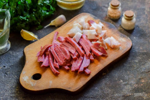 Також наріжте смужками або кубиками копчену ковбасу, бекон.