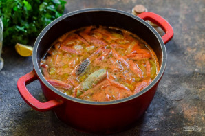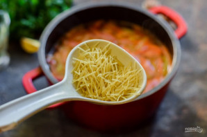 Проваріть суп із заправкою 15 хвилин, додайте спеції та вермішель, варіть ще 3-4 хвилини.