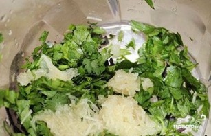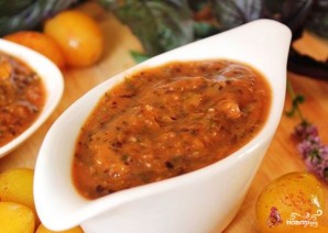 Зелень помийте, обсушіть і наріжте. Викладіть її в блендер разом із подрібненим часником та спеціями. Кісточки вийміть із слив, фрукти додайте туди ж разом із 0,5 склянки їхнього відвару. Збийте до однорідної маси.