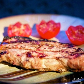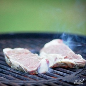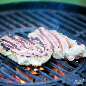 Выкладываем маринованные стейки на гриль и обжариваем 4-5 минут с одной стороны (в зависимости от желаемой степени прожаренности).