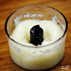Лук чистим и измельчаем при помощи блендера или кухонного комбайна до пюреобразной консистенции.