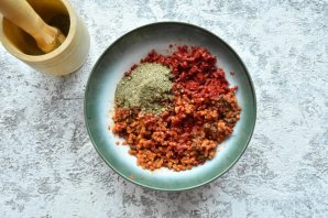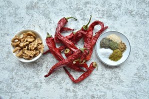 Подготовьте продукты для приготовления сухой аджики по-грузински. Перец заранее необходимо подсушить. В качестве дополнения можно использовать предпочитаемые пряные травы: петрушку, базилик, укроп или кинзу. Грецкие орехи подсушите в сухой сковороде.