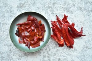 Подготовьте перцы. Удалите семенные коробочки. Если перцы сухие, заранее залейте кипятком, чтобы они напитались влагой. Затем откиньте перцы на сито чтобы стекла лишняя жидкость.