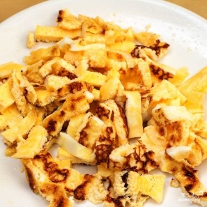 Яйца взбиваем, жарим из них плоский омлет. Когда остынет - нарезаем на полоски.