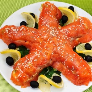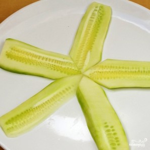Огурец разрезаем на 5 тонких пластинок, выкладываем на блюдо в форме звезды.