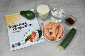 Подготовьте продукты для приготовления "Онигирадзу" или суши сэндвичей. Из данного количества продуктов получается 8 штук. Если используете варено-мороженные креветки, достаточно довести их до кипения в подсоленной воде и проварить 2-3 минуты, после чего очистить от панциря. Не забудьте у крупных креветок удалить кишечную вену со стороны спинки.