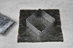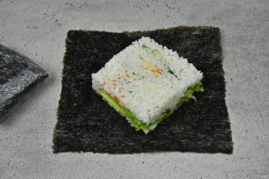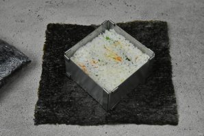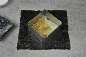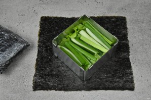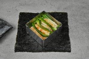 Выложите на рабочую поверхность лист нори, блестящей стороной вниз. Очень удобно собирать начинку используя сервировочную квадратную форму.