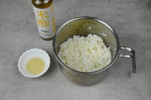 Готовый рис аккуратно, чтобы не нарушить целостность зерна, разрыхлите бамбуковой палочкой или вилкой. Размешайте в рисовом уксусе сахар и заправьте еще теплый рис. Перемешайте.