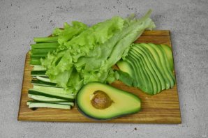 Подготовьте овощи. Свежий огурец освободите от сердцевины с семечками и нарежьте соломкой. Зеленый лук нарежьте на сегменты по размеру огуречной соломки. Листья салата помойте и просушите. Авокадо разрежьте пополам, удалите косточку, кожуру и нарежьте тонкими ломтиками.
