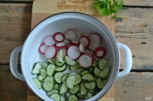 Редис поріжте тонкими кружочками, а огірки — півколами такої самої товщини.