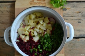 Буряк натерти на великій тертці, варену картоплю нарізати кубиками, зелений цибулю дрібно порізати. Всі інгредієнти з'єднати в мисці та перемішати.