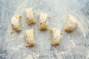 Рабочую поверхность посыпьте мукой и выложите тесто. Сформируйте из теста колбаску и разрежьте ее на 6 частей.