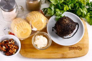 Выложите ядра грецких орехов на свекольную массу, украшая блюдо. Выложите готовые тарталетки на листья салата или петрушки и подайте к столу.
